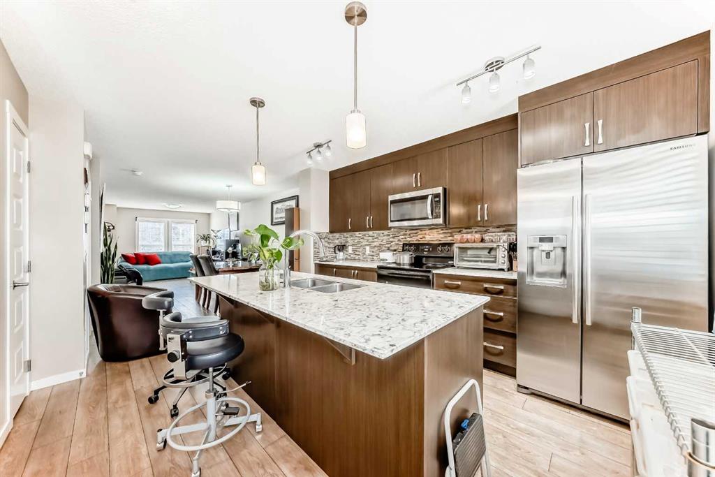 Welcome to this beautifully maintained townhouse in the heart of Auburn Bay! Located just one block from all major amenities—including Superstore, restaurants, movie theatres, South Health Campus, and the largest YMCA in Calgary—this home offers unbeatable convenience and lifestyle. As you step inside, you’re welcomed by a spacious open-concept main floor featuring a bright living room and dining area. The kitchen is finished with quartz countertops, upgraded backsplash, and a newer refrigerator. Durable laminate flooring runs throughout the entire main level, creating a clean and cohesive look. Upstairs, you’ll find two generously sized bedrooms, each with its own full bathroom. The primary bedroom features a 4-piece ensuite, while the second bedroom offers a well-sized layout with its own 3-piece bath—perfect for guests, roommates, or family members. A standout feature of this home is the amazing attic storage space with pull-down hatch and foldable stairs—ideal for storing seasonal items and extra belongings. Additional highlights include: Private fenced yard; Newer hot water tank; Walking distance to the beautiful Auburn Bay Lake; Quick access to Exit 88, Stoney Trail, and Deerfoot Trail. This home offers comfort, functionality, and an exceptional location—perfect for first-time buyers, small families, or investors. MLS®: A2288110 - Auburn Bay 2 Storey $359,900