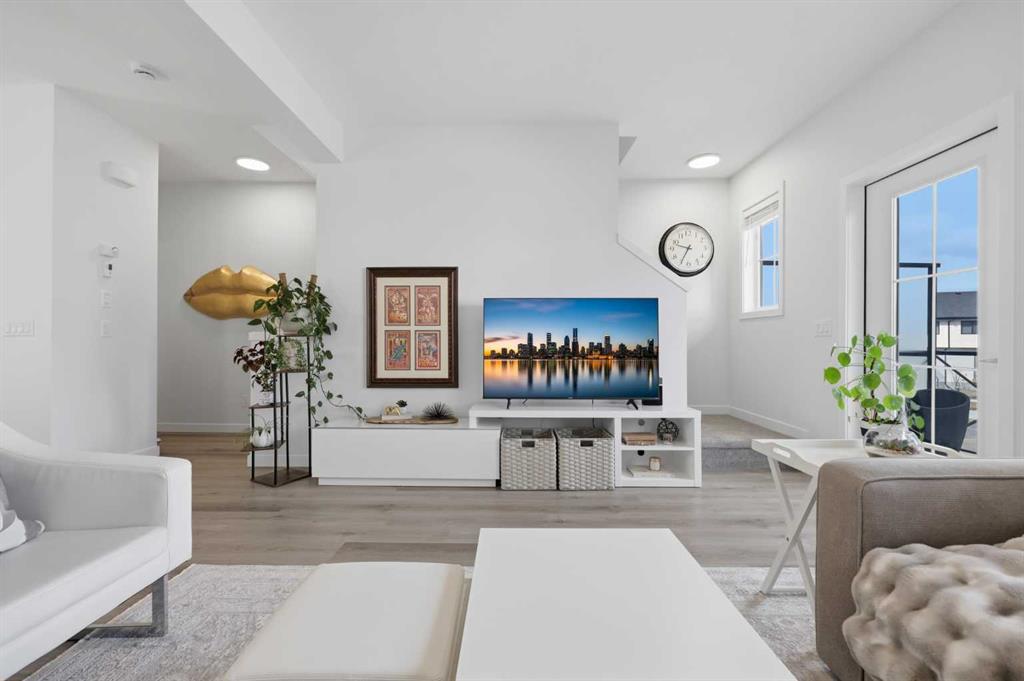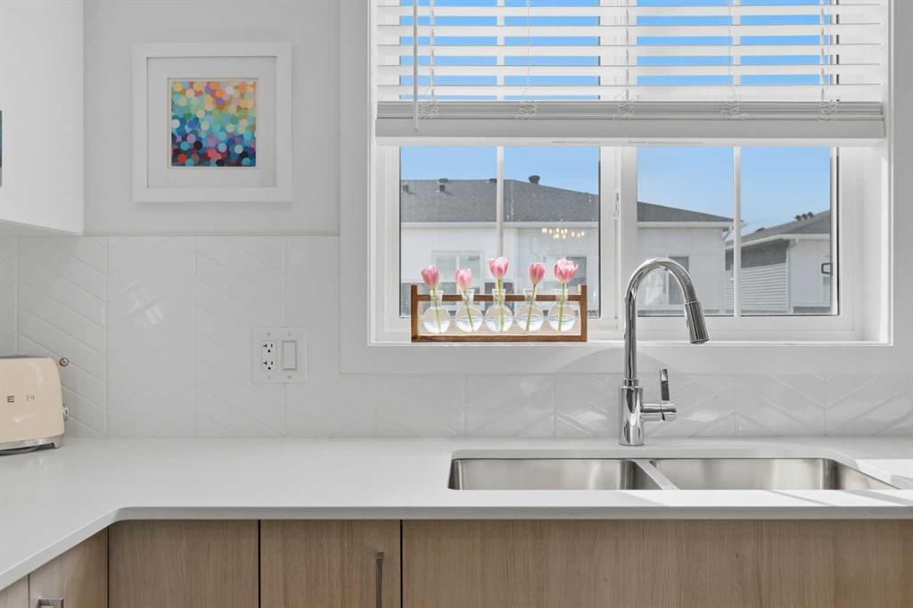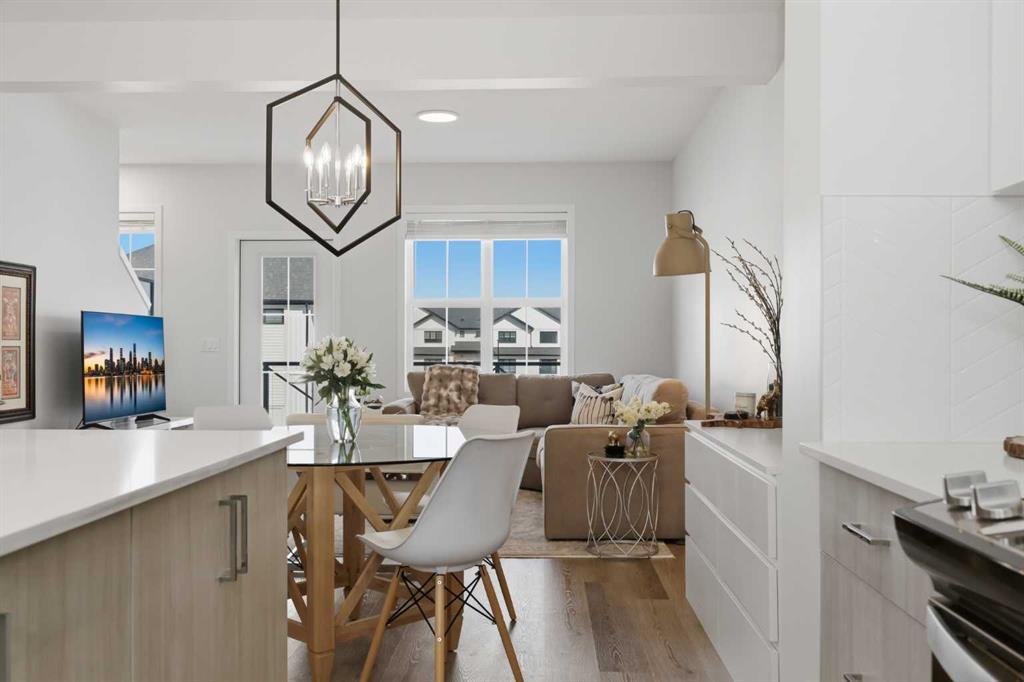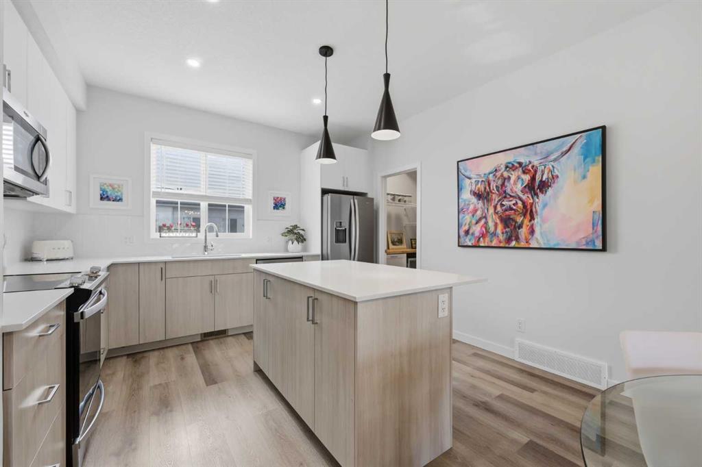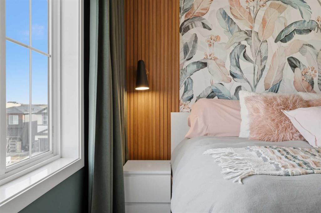 Welcome to Ambleton Mews! This home is designed to feel more like a detached house than a typical townhouse. With over 1,600 square feet, it offers wide, bright living spaces, modern style, smart design, and a long list of features across three finished levels. The entry-level sets the tone immediately, featuring a double-attached heated garage with under-stair storage, and a versatile bonus room that's perfectly suited as a home office, guest suite, or den. Upstairs on the main floor, you'll immediately notice the quality of finishes. The open-concept kitchen, dining, and living area is anchored by dual-tone cabinetry, topped with polished White Macchiato quartz countertops. A full suite of stainless steel Whirlpool appliances includes a French-door refrigerator with water dispenser, an electric range with air fryer, a built-in dishwasher, and an over-the-range microwave. The striking white chevron tile backsplash runs full height, and elevated 42" upper cabinets maximize every inch of storage. Black pendant lighting over the island and a matching chandelier in the dining area add a designer edge. Just off the kitchen, the walk-in pantry has been upgraded well beyond the standard, featuring cabinetry, butcher block countertop, bar fridge, and wire shelving. It's a true butler's pantry that will impress even the most discerning chef. A private balcony off the main floor is roughed in with a natural gas line, ideal for year-round entertaining. The main-floor powder room has been finished with charming board-and-batten wainscoting and delicate floral wallpaper, elevating what is often an afterthought into a genuinely stylish space. The upper floor is a highlight of this home. The primary bedroom feels like a peaceful retreat, with a wood-slat and wallpaper accent wall and elegant wall sconces for a boutique-hotel feel. The walk-in closet has a custom built-in system with double and single hanging sections, open shelves, and a dresser with drawers. The four-piece ensuite bathroom features a dual vanity with quartz countertops, polished chrome Moen fixtures, Calacatta porcelain tiles, and a glass-enclosed shower for a spa-like experience. There are two additional bedrooms on this floor, sharing a four-piece main bathroom with the same quality tile and fixtures. The laundry area is also upstairs, with a stacked Whirlpool front-load washer and dryer for convenience. Throughout the home, LVP flooring flows across the main level and flex areas in a warm tone, while plush carpet adds comfort in all bedrooms. Window coverings and blinds are included on every window, move-in ready from day one. Outside, the community offers a great quality of life. Scenic pathways wind around the nearby storm pond. There is a future school site nearby, and well-maintained paths connect parks, playgrounds, and green spaces woven throughout the area. Ambleton is a community thoughtfully designed for an active, connected way of life. MLS®: A2302244 - Moraine 3 (or more) Storey $519,900