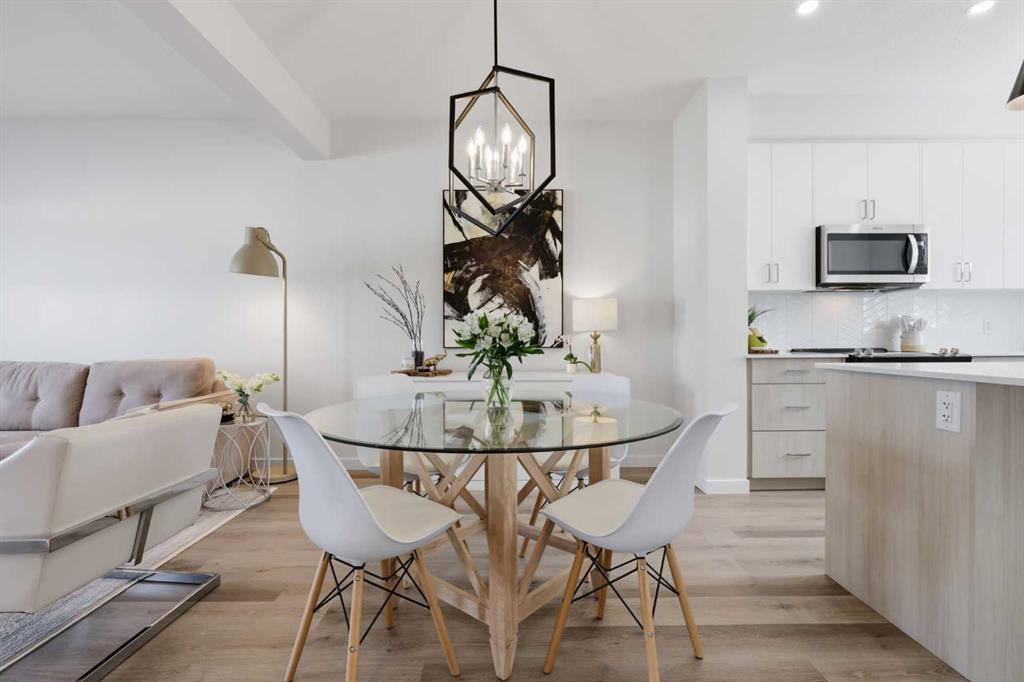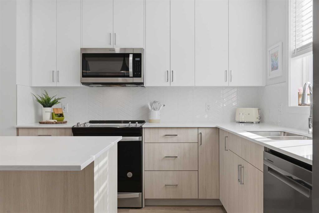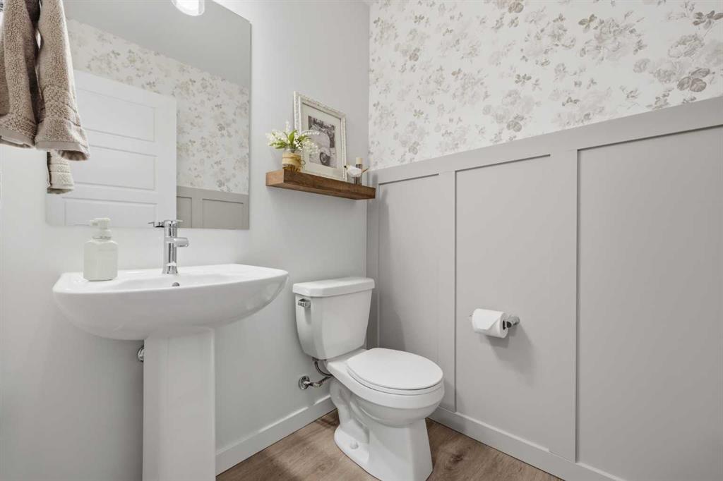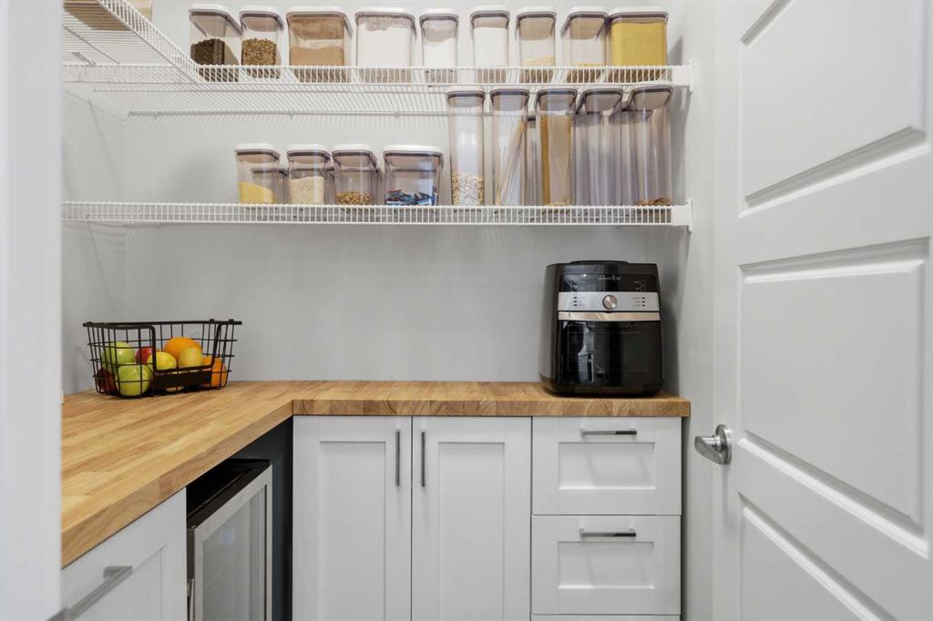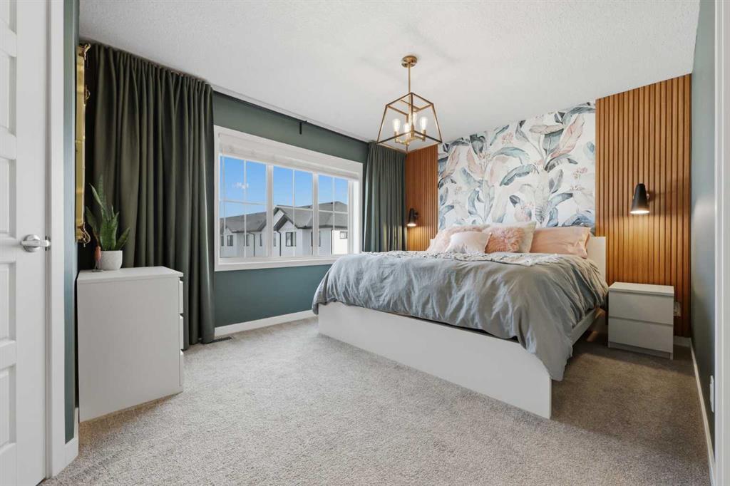 Welcome to Ambleton Mews! This home is designed to feel more like a detached house than a typical townhouse. With over 1,600 square feet, it offers wide, bright living spaces, modern style, smart design, and a long list of features across three finished levels. The entry-level sets the tone immediately, featuring a double-attached heated garage with under-stair storage, and a versatile bonus room that's perfectly suited as a home office, guest suite, or den. Upstairs on the main floor, you'll immediately notice the quality of finishes. The open-concept kitchen, dining, and living area is anchored by dual-tone cabinetry, topped with polished White Macchiato quartz countertops. A full suite of stainless steel Whirlpool appliances includes a French-door refrigerator with water dispenser, an electric range with air fryer, a built-in dishwasher, and an over-the-range microwave. The striking white chevron tile backsplash runs full height, and elevated 42" upper cabinets maximize every inch of storage. Black pendant lighting over the island and a matching chandelier in the dining area add a designer edge. Just off the kitchen, the walk-in pantry has been upgraded well beyond the standard, featuring cabinetry, butcher block countertop, bar fridge, and wire shelving. It's a true butler's pantry that will impress even the most discerning chef. A private balcony off the main floor is roughed in with a natural gas line, ideal for year-round entertaining. The main-floor powder room has been finished with charming board-and-batten wainscoting and delicate floral wallpaper, elevating what is often an afterthought into a genuinely stylish space. The upper floor is a highlight of this home. The primary bedroom feels like a peaceful retreat, with a wood-slat and wallpaper accent wall and elegant wall sconces for a boutique-hotel feel. The walk-in closet has a custom built-in system with double and single hanging sections, open shelves, and a dresser with drawers. The four-piece ensuite bathroom features a dual vanity with quartz countertops, polished chrome Moen fixtures, Calacatta porcelain tiles, and a glass-enclosed shower for a spa-like experience. There are two additional bedrooms on this floor, sharing a four-piece main bathroom with the same quality tile and fixtures. The laundry area is also upstairs, with a stacked Whirlpool front-load washer and dryer for convenience. Throughout the home, LVP flooring flows across the main level and flex areas in a warm tone, while plush carpet adds comfort in all bedrooms. Window coverings and blinds are included on every window, move-in ready from day one. Outside, the community offers a great quality of life. Scenic pathways wind around the nearby storm pond. There is a future school site nearby, and well-maintained paths connect parks, playgrounds, and green spaces woven throughout the area. Ambleton is a community thoughtfully designed for an active, connected way of life. MLS®: A2302244 - Moraine 3 (or more) Storey $519,900