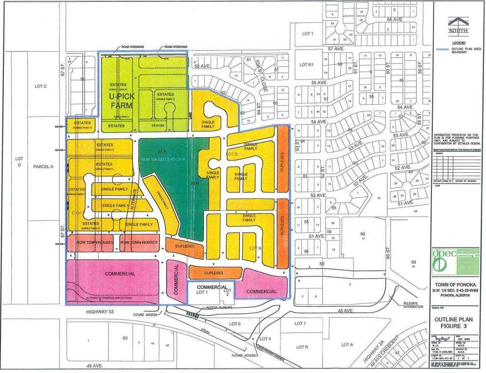 Prime Development Land spanning 70.70 acres with Area Structure Plans, offering a strategic opportunity for land development. The two parcels, 6510 Hwy 53 (Urban Reserve, 53.27 acres) and 6302 48 Avenue (C2 Commercial / Urban Reserve, 17.43 acres), are available for a large contiguous parcel, providing over 70 acres for a master-planned community in Ponoka or can be sold individually. The site features flat topography, excellent development flexibility for staged capital construction, and options for commercial, single-family, and multi-family residential projects. The NW5-43-25-W4 lands offer a short- to medium-term development opportunity in the Town of Ponoka, with existing services nearby, residential neighbourhoods in proximity, and strong frontage potential along key transportation routes. This parcel is uniquely positioned for a mixed-use concept combining commercial, medium-density residential, and single-family housing, with superb access and visibility along Highway 53 and underground services nearby. Explore the supplements for more detailed information on the ASP outline plans, including sanitary sewer and water main concepts, as well as grading and storm water management concepts. Seize this development opportunity now or hold it for the future! MLS®: A2272356 - Central Ponoka $1,499,900